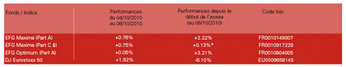 En outre, la régulation de la monnaie n’est pas la priorité de la BCE et il est fort peu probable que M. Trichet prenne le risque de s’éloigner des sentiers battus pour soutenir la compétitivité exportatrice des pays de la Zone Euro. Suite à la baisse de la semaine précédente, nous avons conservé une approche prudente lundi 4 et mardi 5 Octobre en début de séance, ce qui nous a empêchés de participer pleinement au rebond des marchés. Nous nous sommes réexposés à des niveaux proches de nos limites d’exposition aux actions au cours de la séance de mardi. Le fonds EFG Maxima progresse de 0.8%, ce qui porte sa performance depuis le début de l’année à +2.2% contre -6.1% pour l’Eurostoxx50. Le fonds EFG Optimum gagne lui 0.1% sur la semaine ce qui lui permet d’afficher 3.2% de gains depuis ses niveaux de fin Décembre.