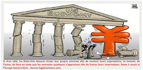 Après l’échec des discussions des ministres du G20, la tâche de corriger les déséquilibres des parités de change actuels revient au G7 du week-end prochain. A leur niveau actuel, le yuan et le dollar sont, en effet, bien loin de refléter leur valeur réelle et font bénéficier les pays concernés d’un soutien significatif aux exportations. Cette baisse du Dollar s’explique directement par les perspectives de nouvelles injections de liquidités par la Réserve Fédérale des Etats-Unis. Inutile de dire qu’en cette période électorale, les autorités américaines ne vont pas se presser pour empêcher cette baisse de la monnaie dont les retombées sur l’économie et l’emploi seront significatives.