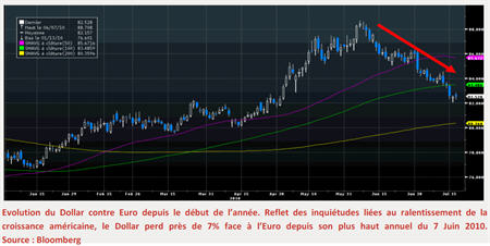A l’inverse, les nouvelles européennes au sujet des dettes souveraines sont plutôt bonnes, notamment, en provenance des pays d’Europe du Sud. Les émissions de dette de la Grèce, de l’Espagne, du Portugal (malgré la dégradation de sa note la veille par l’agence Moody’s), et de l’Italie ont ainsi rencontré une forte demande, ce qui a permis de rassurer les investisseurs sur la santé financière de l’Europe. Néanmoins, il convient de rester prudent à l’approche de la publication, Vendredi 23 Juillet, des tests de résistances auxquels ont été soumises les banques européennes afin de s’assurer de leur solidité en temps de crise. Ceux-ci pourraient réserver quelques surprises.