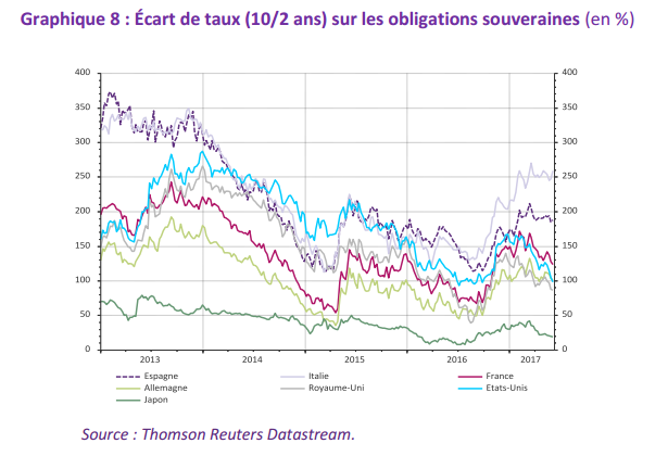 Depuis l’automne 2016, une remontée des taux longs est toutefois perceptible de part et d’autre de l’Atlantique, du moins jusqu’au printemps 2017. Aux États-Unis, ce mouvement traduit à la fois les anticipations de normalisation monétaire et celles d’une politique budgétaire et fiscale expansionniste avec l’élection de Donald Trump à la présidence.